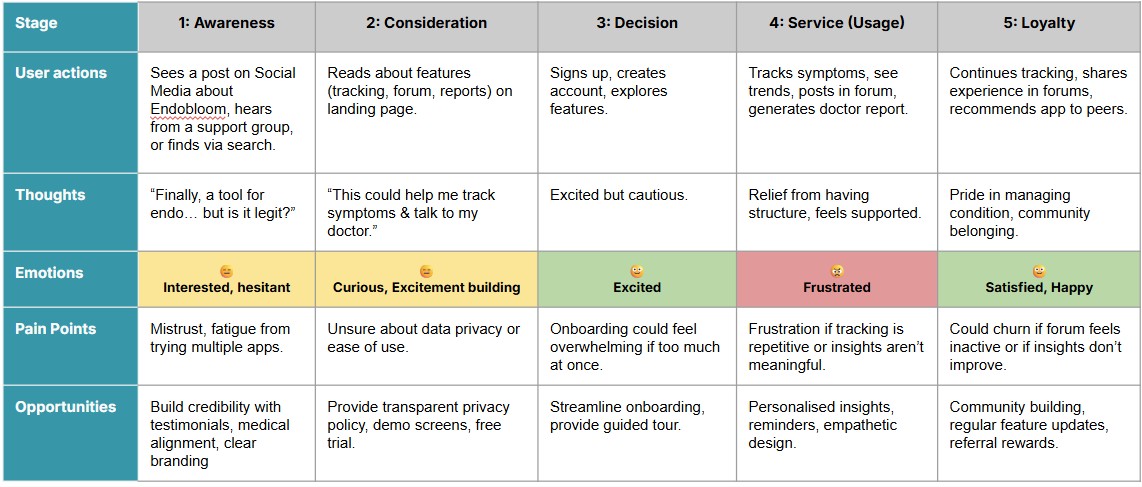 I created a high level product roadmap to guide the phased strategy for building and scaling EndoBloom, ensuring priorities stay align with user needs.