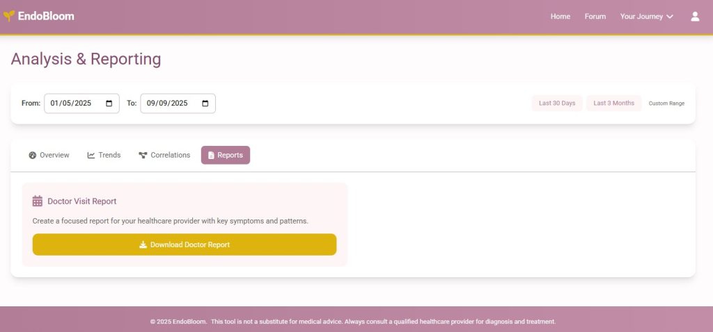Endometriosis symptoms vary wildly and unpredictably. Logging helps users recognise what is normal for them and uncover trends with AI assistance.