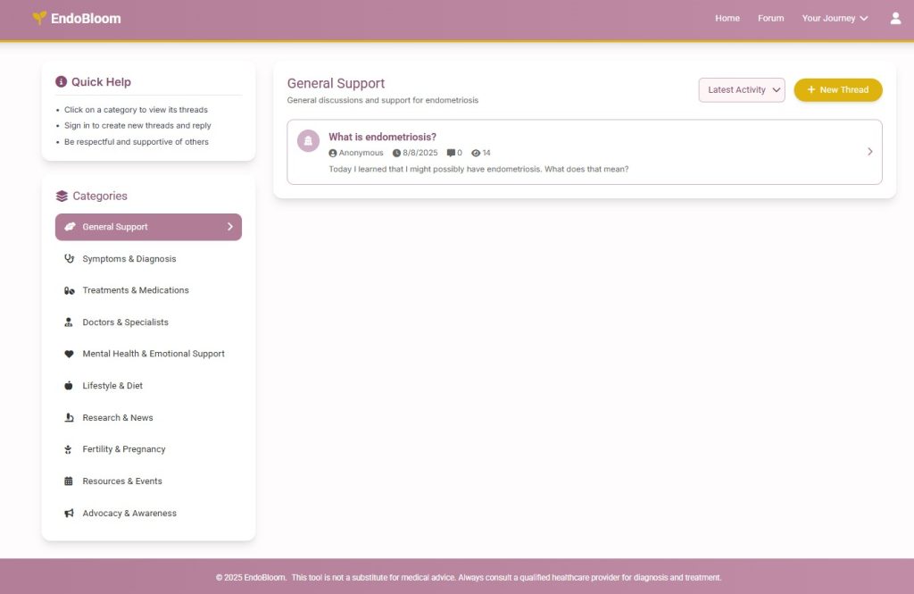 A forum feature was designed to provide a safe, supportive space for people with endometriosis to share experiences and advice.