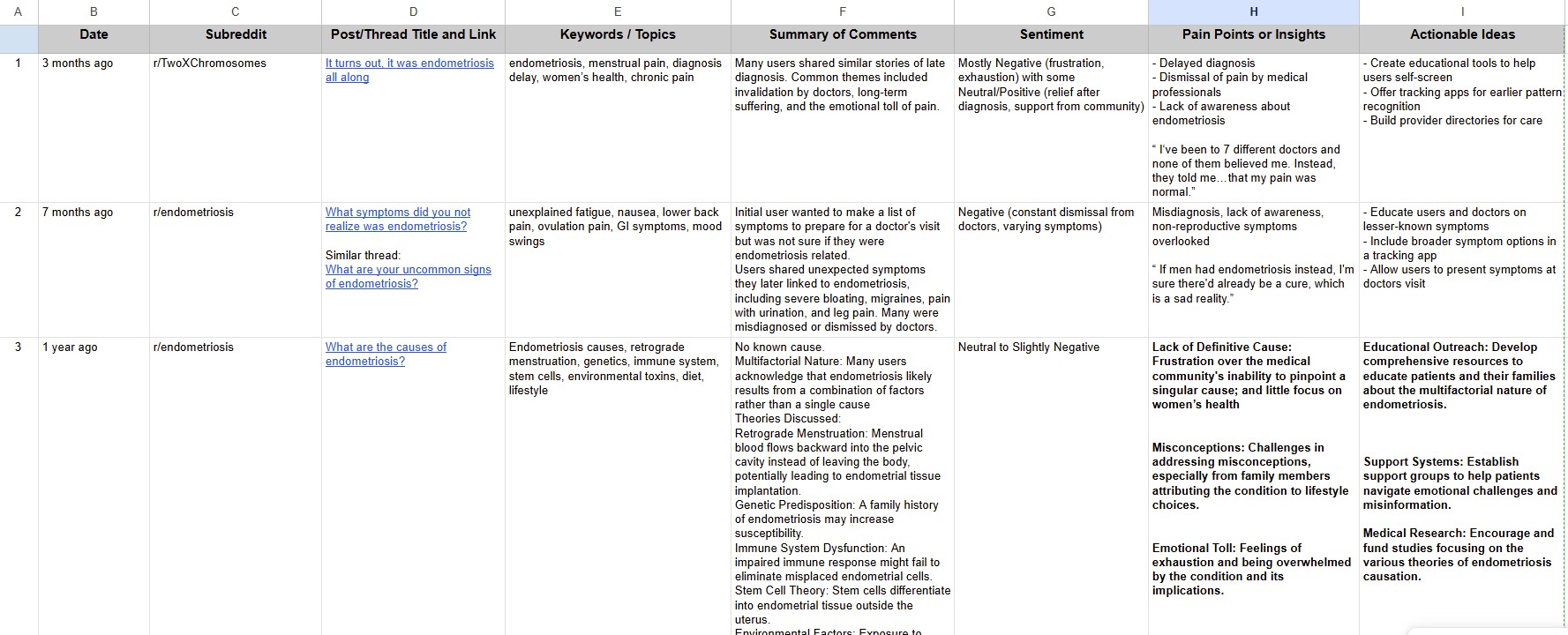 To understand the experiences of people with endometriosis, I conducted social listening across multiple Reddit communities dedicated to the condition.
