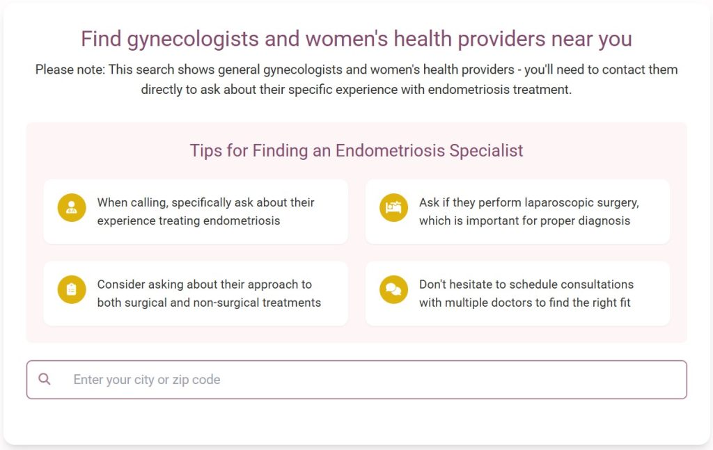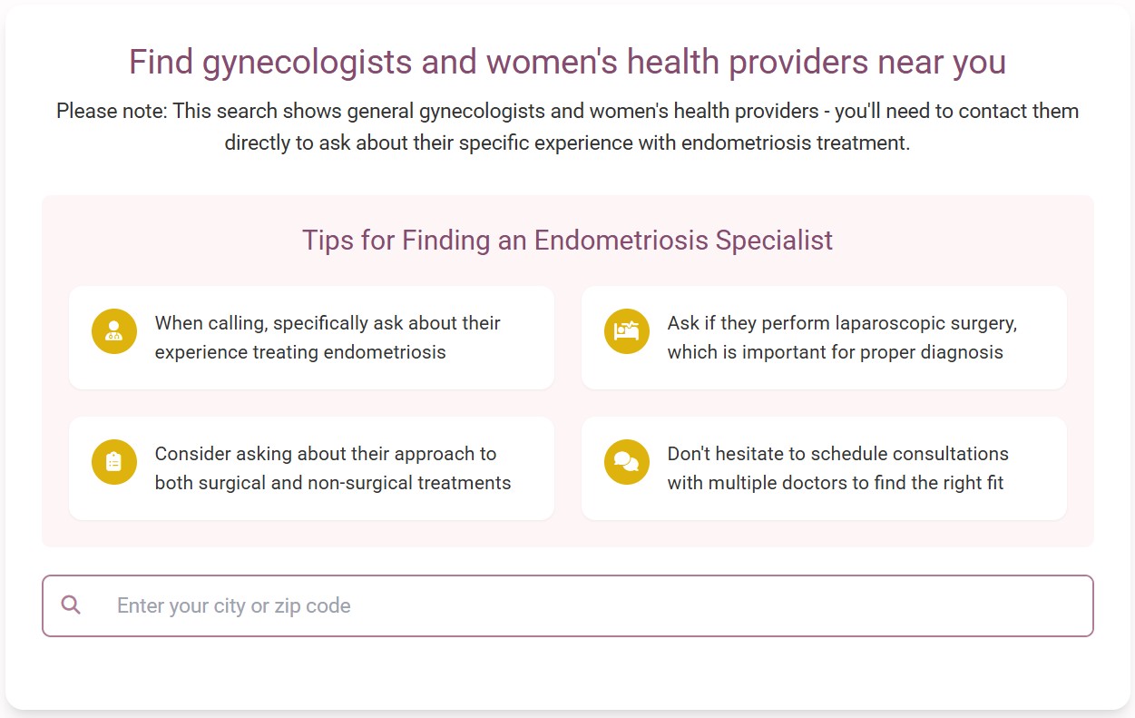 - Find Specialists: Search for gynecologist with guidance for selecting those experienced with endometriosis